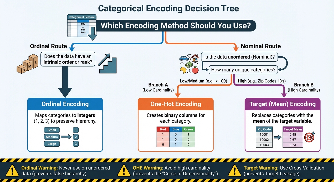 3 Sensible Methods to Encode Categorical Options for Machine Studying: A Flowchart (click on to enlarge)