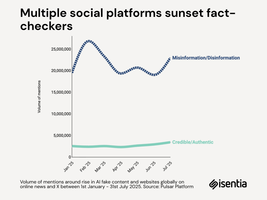 We analysed 30M knowledge factors between 1st January 2025 – twelfth August 2025 globally on social and mainstream media like X, Boards, On-line information, LinkedIn, TikTok, Instagram and Fb. We checked out actual world instances of how audiences have been misled to consider one thing is actual, and the way this began a domino impact on the content material being consumed by the world as we speak.