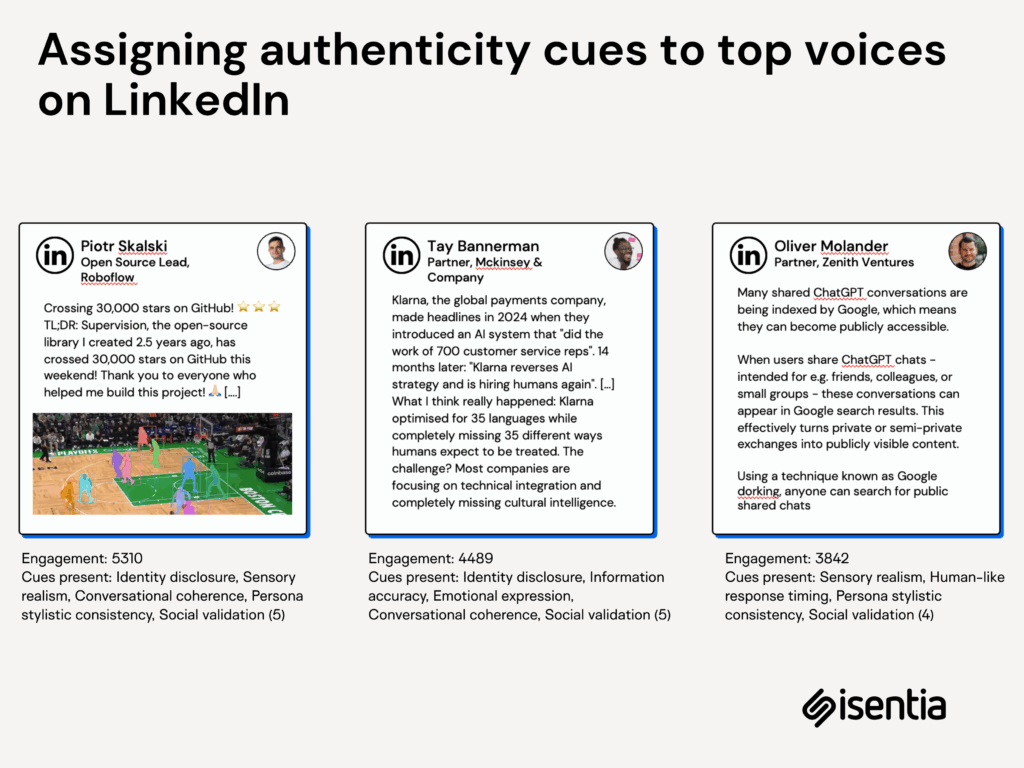 Taking a look at how tech leaders submit on LinkedIn exhibits simply how highly effective authenticity cues could be. Piotr Skalski’s celebration of hitting 30,000 GitHub stars mixed id, visuals, group validation, and extra – and it drew the very best engagement. Tay Bannerman’s submit leaned on accuracy, cultural perception, and emotion, incomes barely much less traction, whereas Oliver Molander’s tackle ChatGPT carried fewer cues general and noticed the bottom engagement of the three. This comparability highlights how posts with a richer mixture of cues are likely to resonate extra, whereas these with fewer alerts wrestle to spark the identical response.