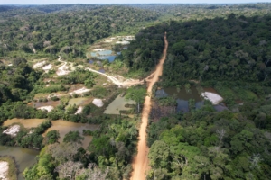Determine 2 A drone picture of unlawful gold mining websites adjoining to the ‘official’ highway of the timber firm, August 2025; Picture courtesy of Da’uk Munduruku audio visible collective