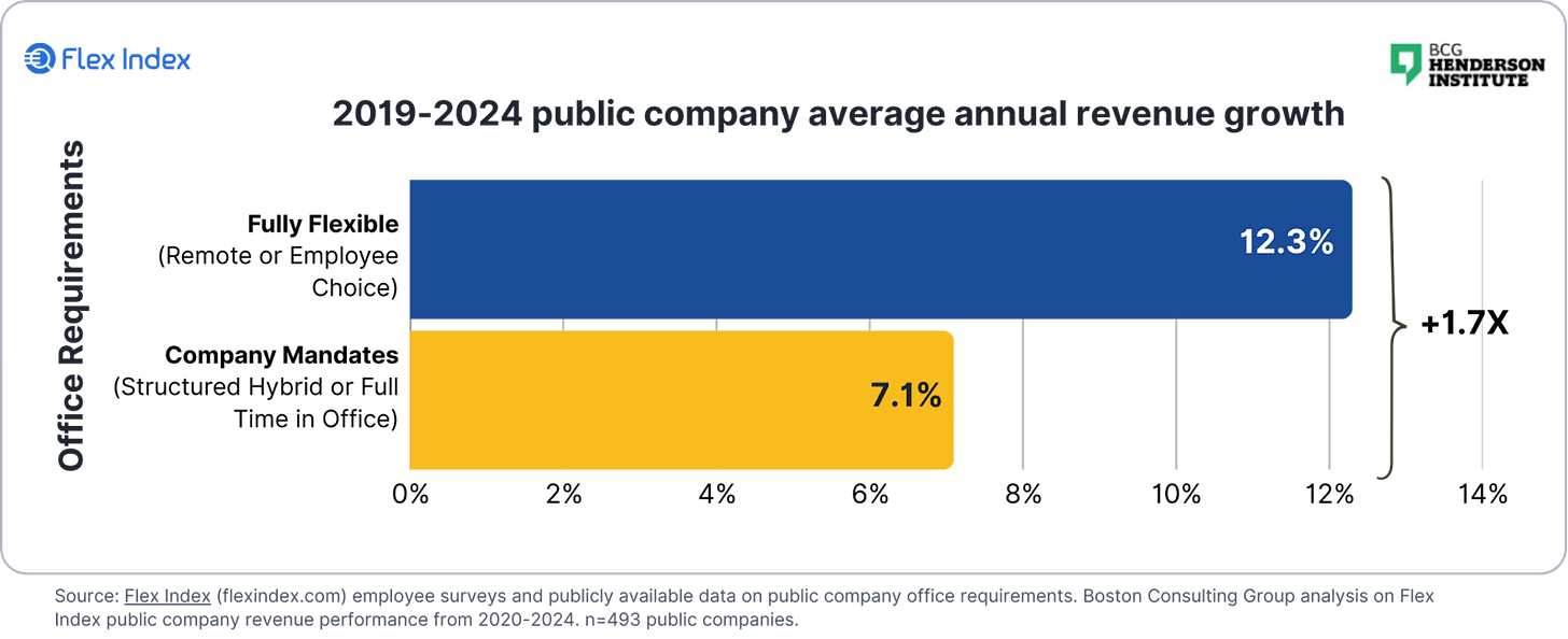 On related strains, Flex Index revealed outcomes of some BCG analysis into the efficiency of US organisations after which matched it to their working insurance policies. Organisations that have been extra versatile tended to develop quicker than corporations who have been totally onsite: